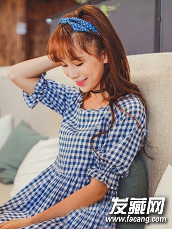 扎马尾,绑扎发带搭配格子连身裙,很有文艺范儿。