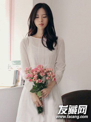 淑女路线MM钟爱的一款文艺发型,乌黑的微卷发丝自然垂肩,中分刘海修颜瘦脸,搭配白色连身裙很有文艺范儿。