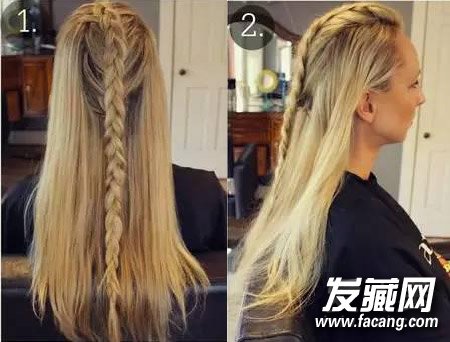 Step 1:留出两边的头发,从头顶开始编法式辫,直至脑后位置。接着开始编三股辫直至发尾,并用皮筋固定。