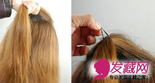 将头顶的头发分层,大概是三分之一的位置。用黑色小发圈将头发束起来。