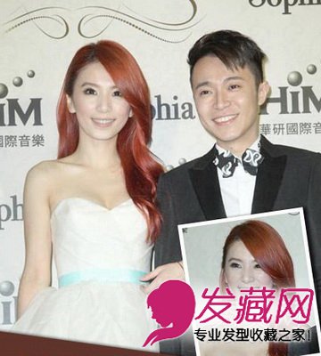 Hebe与吴青峰是伴娘和伴郎,Hebe一头红色的大卷发亮相,发质很好很有光泽,从发尾最先向外翻的大 卷,一侧在垂在肩上,长刘海正好修饰脸型。