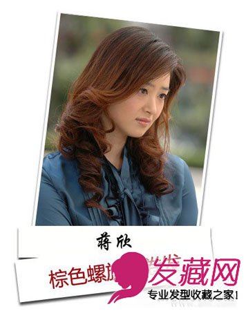 棕色渐变的大卷发让蒋欣更有有女人味,从耳下最先的大卷,螺旋状的大卷让脸庞越发细腻。