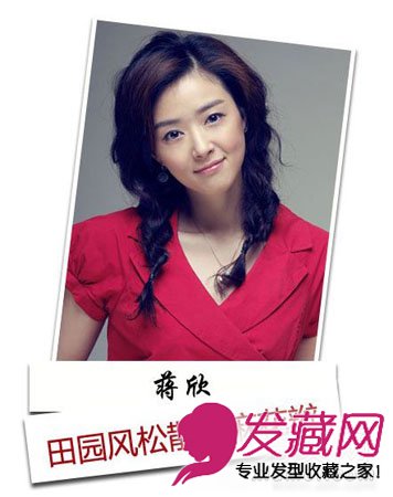 看看蒋欣这款发型就知道她是一个小女人,很田园风的一款发型,松散的双麻花辫,蓬松的发顶, 俏皮的发尾,可爱的心情,真真是个小女孩。