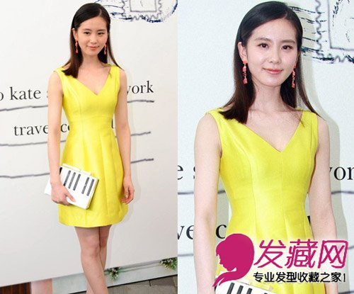 将刘海全部固定在后面,ALL-BLACK的造型更显时尚范,荧光色的连衣裙很是抢镜。