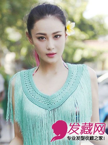 将全部长发梳到后面,再高高扎起马尾,耳戴鲜花,搭配淡雅裸妆,展现清新魅力。