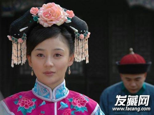 那一串珠帘和头花的颜色好特别,十分像暴晒在太阳下面褪色的样子。而“珠帘前面一朵花”的造型在清宫剧中也算特别了!