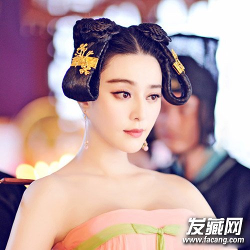 这款发型是范冰冰扮演的武如意初入宫闺,着一席粉色纱裙灵动婀娜,而发型则是用的双环垂髻,是当时唐代最为流行的,在头的两侧各盘成上卷下垂环,展现出了稚气未脱的少女情怀,简直颜值爆表。