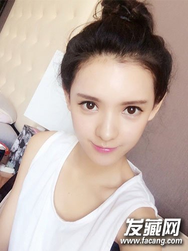 露额造型让五官看起来十分立体,头发梳到头顶,弄成花苞状,显得清新可爱。