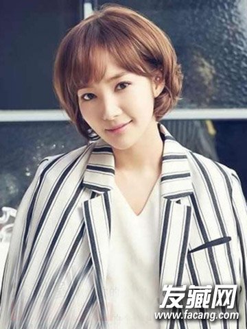 剪短发依旧不会失去女人味,学习朴敏英,换个显嫩的棕栗染发色,发间微卷,加上可爱的韩式刘海,职场女性也可以时尚减龄。