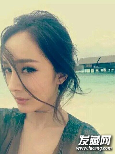 杨幂私照发型,长发随风凌乱,很显风情,简单扎发发型超显甜美气质,度假也是美美哒。