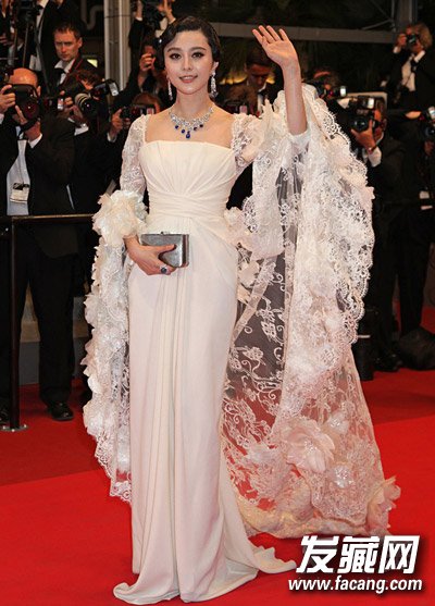 白色修身礼服,复古卷发,复古路线下的范冰冰显得很小女人了,只是与其他造型相比,那大片的蕾丝显得有点廉价。