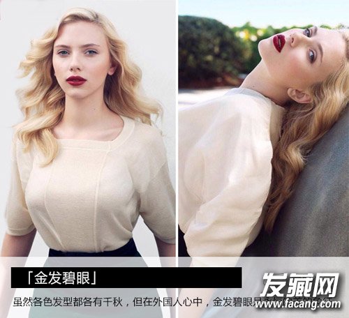 金发碧眼是外国人心目中美女的最佳象征,因天生金发的已经越来越少,所以尤为珍稀,而且也并不是所有白种人均适合染成浅金色发色,立体标致的五官让斯嘉丽尤为适合这种发色,配上烈焰红唇更具复古风韵。