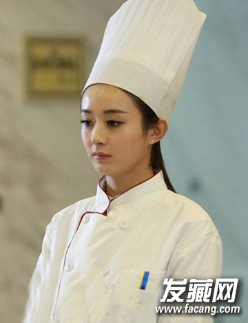 长发披肩,一身白色厨师袍,戴上高檐厨师帽,变身美丽厨娘的赵丽颖,清新的五官,依旧难掩美貌。