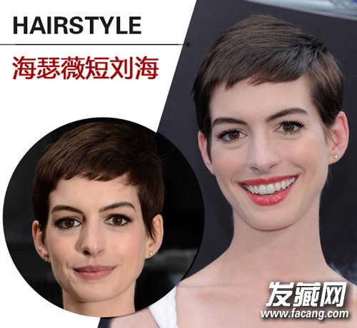 安妮·海瑟薇之前的短刘海造型诠释中性魅力,搭配精致女人味妆容,两者相互碰撞打造出新视觉美感,让人眼前一亮。