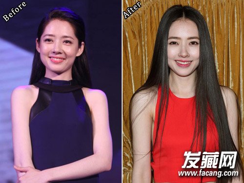将头发全部梳起只能暴露宽大的下颌,把头发披散下来,柔和、纤细的长直发可以遮挡脸部最宽的下颌,将视线集中在脸部中央,适合像郭碧婷一样温柔娴静的女孩。