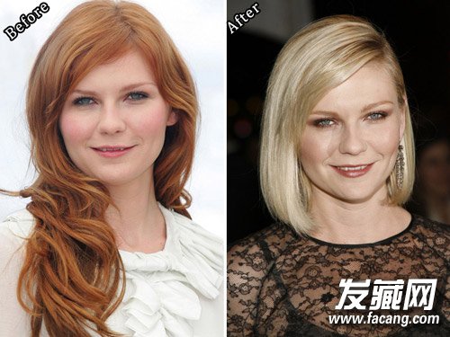 圆脸不要在脸附近出现过多圆形的发卷,不易察觉的轻微波浪更适合你。顺直或略带弧度的长波波头很适合圆形脸,选择中分或侧分都可以让视线集中在脸部中间,有拉长视线效果。Kirsten Dunst换成了冷色调金发,视觉上有收缩效果,比姜红色看起来更显脸小。