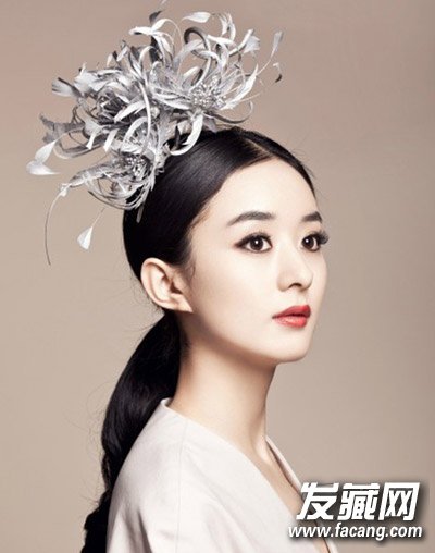 本来应该是可爱代名词的赵丽颖,配上创意感十足的皇冠发饰后,也颇有高冷公主范,中分的刘海配上低马尾,在发尾处做出卷度,素雅中带着高冷,就如同后期的花千骨。