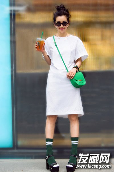 配上蓬松丸子头减龄似少女,很显青春范儿。