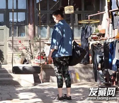 拍戏的时候梳,这张剧照中,小宋佳牛仔外套配七分迷彩,运动鞋照常,丸子头率性,青春气息十足。