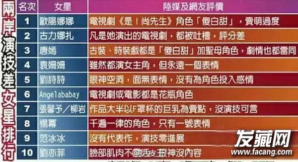 现在的娱乐圈完全就是看脸吃饭,粉丝给力,明星就混得好,跟演技什么的好像关系也不大。一般公认的演技差的女星都有谁呢?杨幂、刘诗诗、angelababy等人气女星纷纷上榜呢,第一名就是是“正当红”的欧阳娜娜。