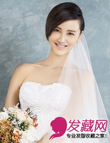 张歆艺的婚纱照造型,美美的她天生丽质,偏分短发新娘头型,头纱缀戴,唯美清新。