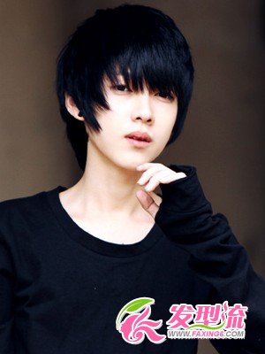 过长的刘海遮住眼眉,鬓角两段层次感修剪的头发贴合轮廓,展现精致小巧的五官。简单的黑色系T恤很符合多数男生的审美,轻易就能打造出美男形象。耳朵上同色系的耳丁装饰令造型更加时尚。