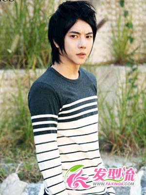 ,长刘海营造出小脸男生,黑色的发色自然不做作,长发让这款韩式发型充满了知性和艺术气息,让五官更加的突显和清新。条纹T大气时尚,很有阳光时尚男的味道。