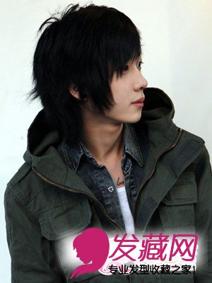 过长的斜刘海并不会遮挡眼睛,恰到好处的连接长鬓角,鬓发贴合轮廓可以减小脸部面积。长发尾拉长了脸部轮廓,显露出菱角分明的五官。搭配军绿色工装外套和内衬牛仔,呈现出男生酷帅有型的个性。