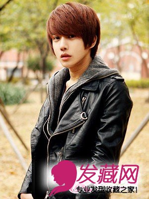 在阳光的照射下,散发出明媚耀眼的光芒。大片的斜刘海发线向前侧边梳理,流畅的线条打造出乖乖男的脸庞。一身酷帅装扮的皮衣营造出男生帅气有型的潮流范儿。