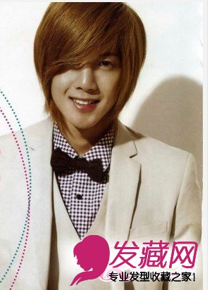 有点像非主流发型一样的韩式男发造型,长长的刘海覆盖住左边的眼睛,露出笑盈盈的右眼,青春阳光又帅气。颜色采用了抢眼的金黄色,看上去很潮很有范儿。黑色的蝴蝶结+格子衬衣,不经意将流露出一丝绅士风情。