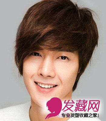 棕色挑染让黑色发丝也能彰显出潮流感,斜刘海遮盖住额头,烘托出精致的脸型轮廓。如果额头不够完美,或者脸型较长的男士,不妨利用刘海设计来改善不足之处吧。让你也能变身花样美男范哦!