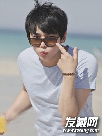 圆脸男生也能尝试的小清新短发哦,黑色的柔顺发型,随性的拨弄着齐刘海,营造出清爽帅气感,如果头发不够饱满可以适当烫一下,夏日出街清爽又吸睛。