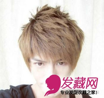 利用发蜡将发顶用手抓蓬,整体发型给人的感觉都有拉长脸型的效果,碎剪发的刘海设计和棕黄色