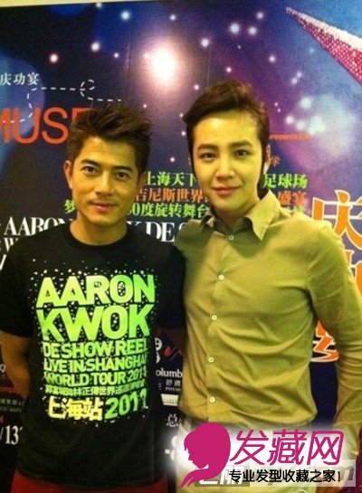 小编点评:将刘海斜分梳向后面,蓬松感的扎发发型,张根硕最近很爱露额发型哦!旁边的郭富城很个性的短发造型。围观美男。