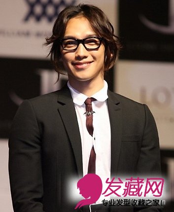 Rain的扎发发型也不是很常见哦!随意自然的马尾,分出两边较长的刘海修饰脸型,戴上眼镜,穿上西装的Rain看上去很CEO哦!