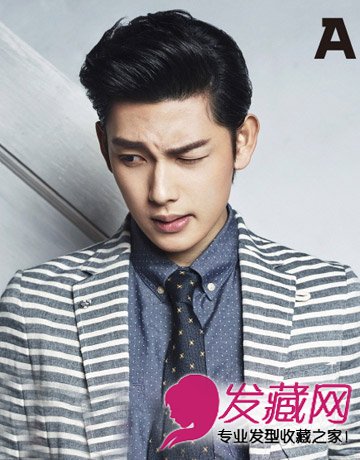 条纹设计的简约西装内搭波点衬衫充满潮感,率性的大背头发型,展露额头,展现了帅气有范儿男孩魅力。
