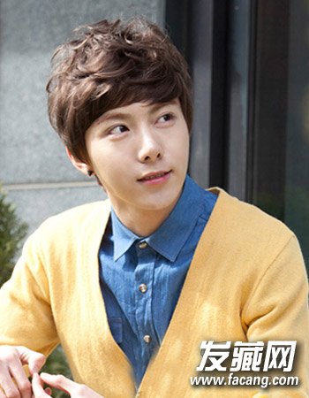 一款清新又显略微的成熟气质感的男生短发卷发发型,这种简单时尚的棕色染发本就是男生们的最爱,而配合纹理烫形式的卷发造型与圆形的高