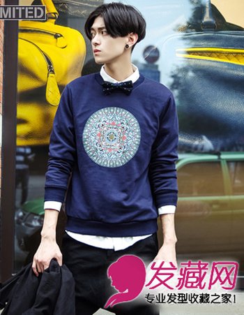 这款中分式的男生刘海造型是不是很显特别呢?乌黑的发色配合男生中分式的规则性长刘海造型除了散发一种艺术气息之外还有一丝复古美男风哦。