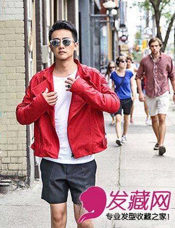 红色夹克搭黑色短裤,混搭也很潮哦,标准的雅痞短发,自然黑发剪出层次弄蓬,加墨镜,酷帅有型。