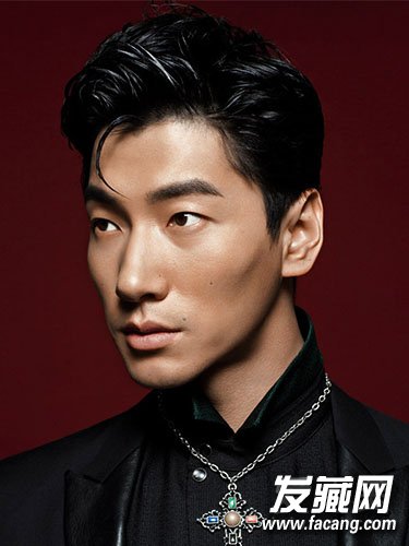额前留下一撮小发,将油亮头发梳到一边,坚定眼神显示男性魄力