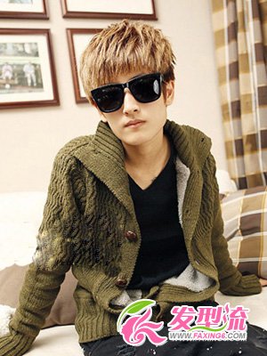 张眼望去,十足的潮男范儿!出位的染发颜色让男生的皮肤看上去更为的白净,这款男生发型可以利用纹理烫烫发或者是在家用发蜡塑造出层层叠叠的纹路!整个发型还是趋向与圆弧形状,有点齐刘海效果的秀发遮住前额,露出男生立体的五官,搭配一副黑色墨镜,帅气可嘉