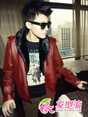 想要成为时尚达人的一员,那么潮男形象的你当然不能错过了这样一款寸发发型!干净利落的修剪显得男生大方有活力,简单中不乏时尚元素的微翘厚重刘怀为整款发型注入了时尚元素,从侧面看上去,男生完美的轮廓展露无遗!立体的五官搭配一副酷酷的墨镜搭配红色皮衣,帅气!