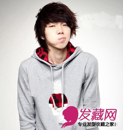 可爱风格的男生发型,设计的关键是刘海,较长的发帘塑造圆形轮廓,盖住大部分额头,结合脸边的鬓发,凸显俏皮的搞怪表情,还能制造小脸。