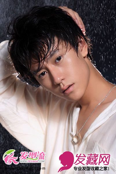 这款打造湿水后的短发效果,刘海部位因湿水后呈现束感强烈的发束,微微卷曲的造型显得发质非常有质感,黑色的原发色发出低调的光泽,秦俊杰诠释着低调与性感。