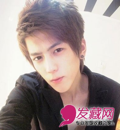 ,刘海向上翘起,棕黄色的染发+蓬松的头顶,阳光健康大男孩。