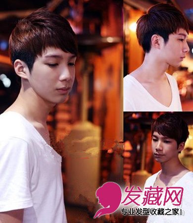 发顶向四周散开并且蓬松,刘海向右侧高出蓬松,很有特点,鬓角较长,突显了男性阳光帅气的一面。