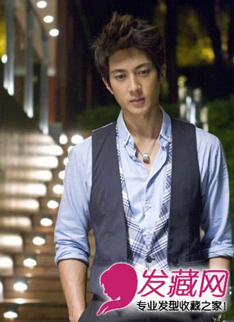 吴尊在公主小妹中扮演一个有钱的富家子弟,刘海向上梳起,露出光亮的额头,蓝色衬衫外搭西装马甲,即贵气有帅气。