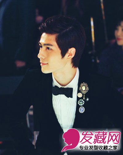 这一套略显正式的西装礼服装扮,二八分短发,梳理光洁倜傥,佩戴领结,变身绅士的白马王子。