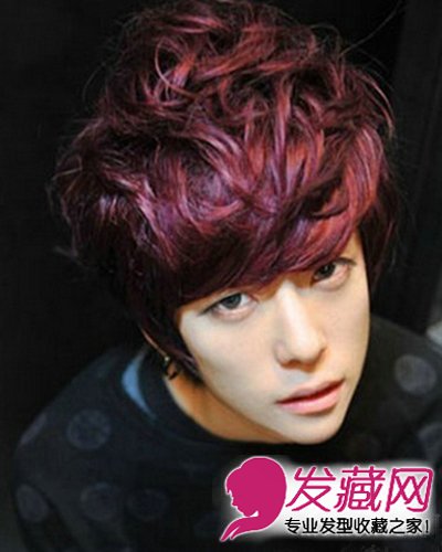 蓬松、凌乱感,这款充满个性的染色男生纹理烫发型,蓬松感,下面凸显出一张精致的小脸,凌乱感又不失自然,抢眼的酒红