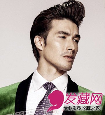 ,复古的湿发造型往后梳理,只在刘海部位高耸起来,西装领带正装现身,成熟魅力逼人。